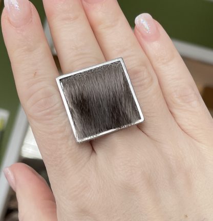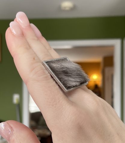 This modern ring is as lovely as it is comfortable to wear! The double band is adjustable, and open on the back, which allows you to wear it on any finger. With your choice of seal fur colour, you can make this ring your own.