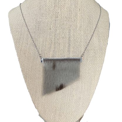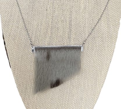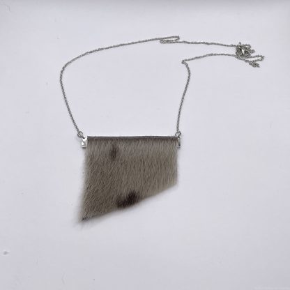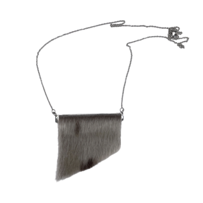 This modern and striking pendant necklace features an asymmetrical rhomboid shaped fur swatch, hanging on a stainless steel horizontal bar. The pendant is 58mm in length, and 58mm in height on its long edge, 35mm in height on its short edge. The necklace is shown in this listing using spotted seal, but you can have this style of necklace made with your choice of seal fur. Displayed chain length is approximately 46cm (18”), but it can be made at a longer length – you can choose your preferred chain length from the drop down menu. Please indicate at checkout if you would like a different chain style. Phocal Stone Designs will modify your order to your specifications if possible.