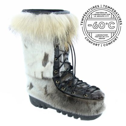 La botte mocassin en loup marin naturel et fourrure de coyote vous gardera au chaud avec style lors de vos expéditions hivernales. Le laçage sur le devant caractérise le modèle mocassin et permet à la botte de s’adapter aux mollets plus forts.