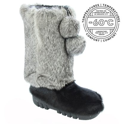 Ces bottes en loup marin avec pompons de lapin gris sont un peu plus longues (15 pouces comparativement à 12) que la botte classique. Le jeu de la densité et des longueurs de poil entre le pied et la jambe donne une impression de petits pieds. En effet, c’est un mélange particulièrement magnifique de fourrures pour un look plus urbain qui vous tiendra au chaud tout en vous donnant fière allure.