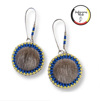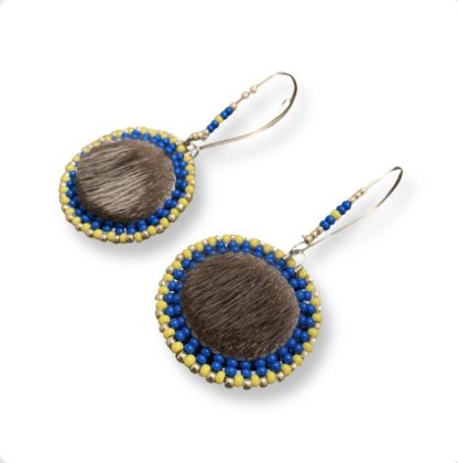 Boucles d’oreilles double face en peau de phoque, bleu, jaune et doré.