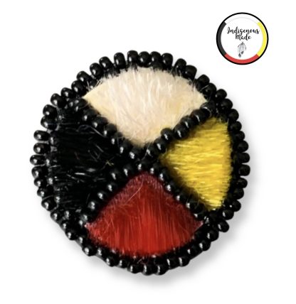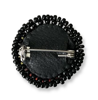 Broche roue de médecine en peau de phoque teinte en 4 couleurs selon des méthodes professionnelles et ornées de perles de rocaille noires de taille 10.