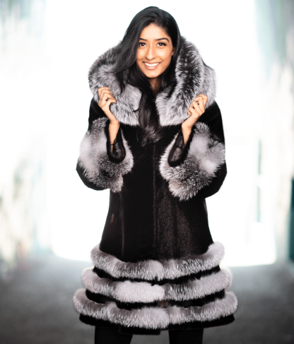 This beautiful seal fur coat with rings of silver fox at the hood, sleeve cuffs, and the knee-length hemline is made for winter fun. It has inseam outer pockets with a hidden inside pocket just for you. Wonderful oversized hood. It is incredibly warm, wind resistant, and water repellant. These natural and ethically sourced materials will stay beautiful and warm in harsh winter conditions.