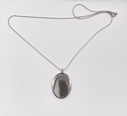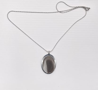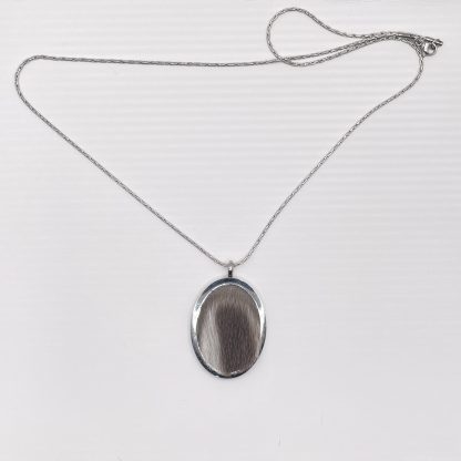 Le pendentif ovale de ce collier présente une bordure en acier inoxydable de 20 x 30 mm, sertie de fourrure de phoque naturelle tachetée. Il est attaché à une chaîne cobra en acier inoxydable imposante, mais tout en élégance (50 cm/20 po de long). Veuillez nous indiquer si vous souhaitez une longueur ou un style de chaîne différent au moment du paiement. Phocal Stone Designs ajustera votre commande selon vos préférences.