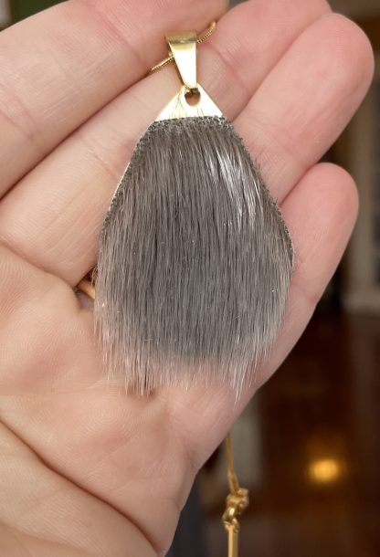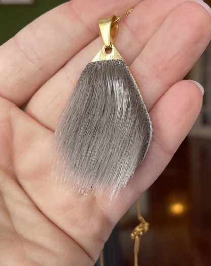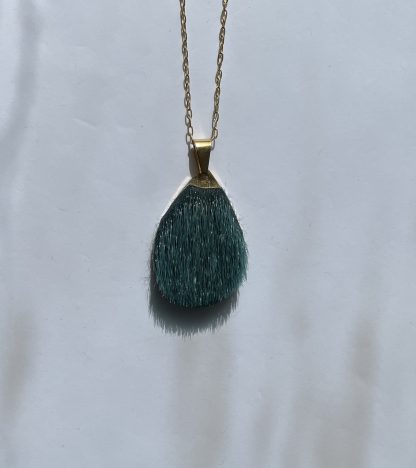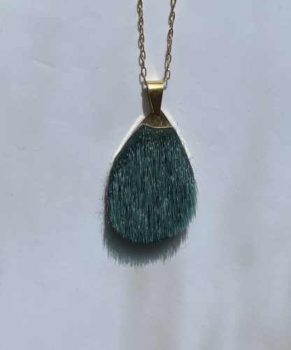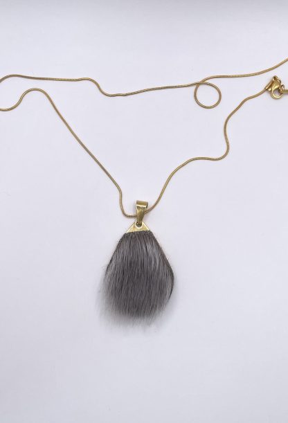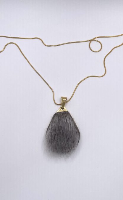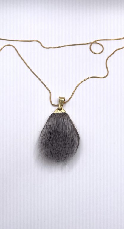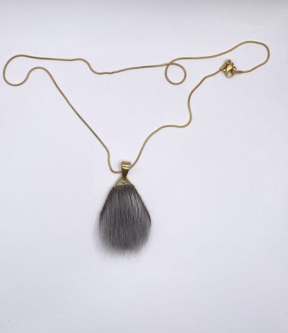 These teardrop shaped pendant necklace feature a variety of different colours of seal fur (natural and dyed).The pendants hang on a sleek, gold plated stainless steel snake chains (46cm / 18” in length). Please indicate at checkout if you would like a different chain style or length. Phocal Stone Designs will modify your order to your specifications if possible.