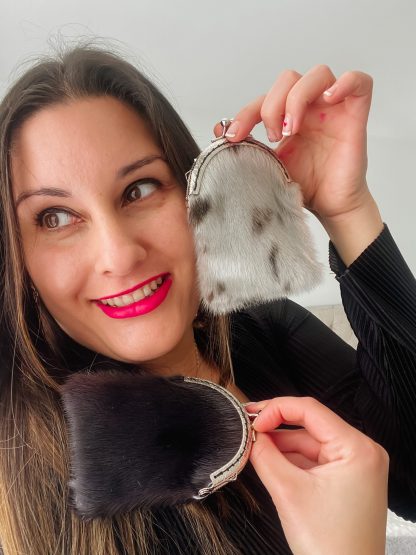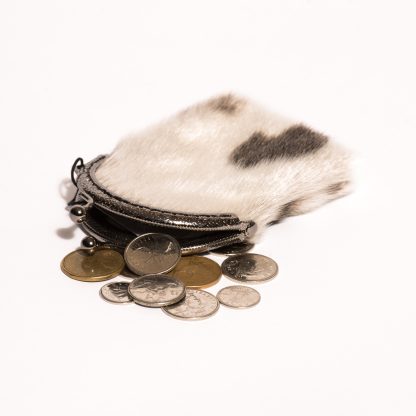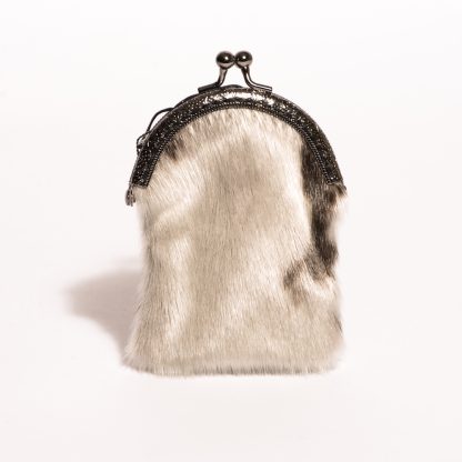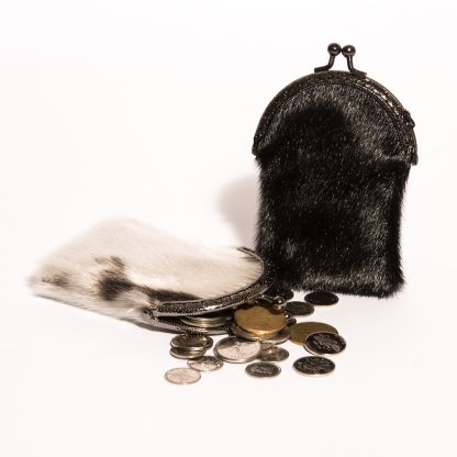 This sweet little coin purse is hand-stitched with Natural or Black dyed Harp Seal Skin. It has a kiss-clasp closure and is unlined. It fits a few cards and lots of change. Enjoy carrying it in your pocket, the seal skin is very tactile, or having it in your bag on the go!