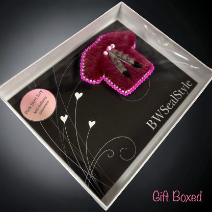 - Professionally Dyed Seal Pelt, Czech seed beads, Leather, safety clasp pin.