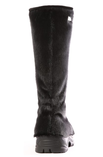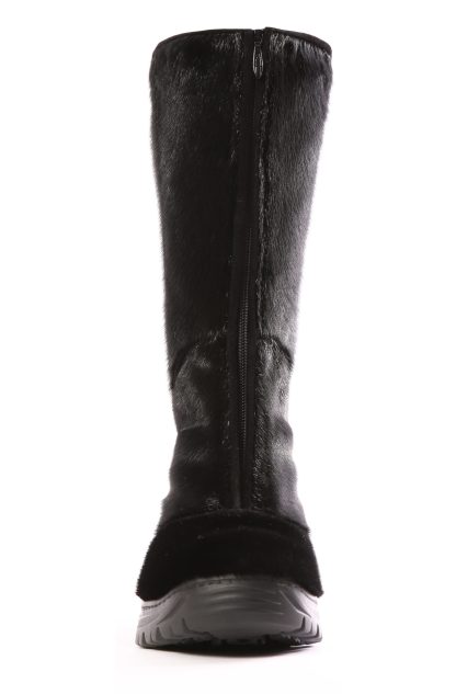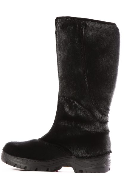 Bottes tout aller pour dame munie d’une semelles avec crampons rétractables permettant d’adhérer sur toutes surfaces. L’extérieur est confectionné avec la fourrure de loup marin teint noir s’agençant à tous types de tenues.