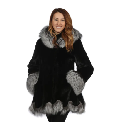 Silver fox fur trims are fixed to the wrists, hood, and hem.