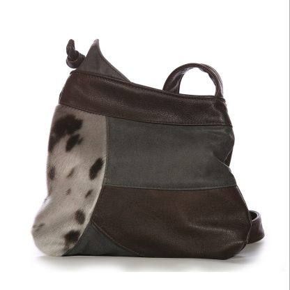 The Ofélie purse with natural seal fur is a cross-body handbag of medium size with a zipper closure. Its play on leather colours and natural seal fur, flared bottom and oversized asymmetrical strap gives the Ofélie a distinctive eye-catching style.