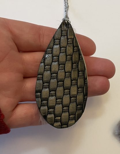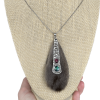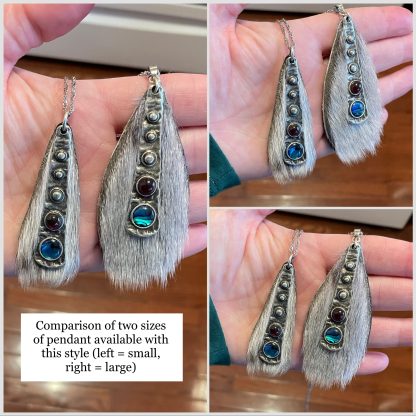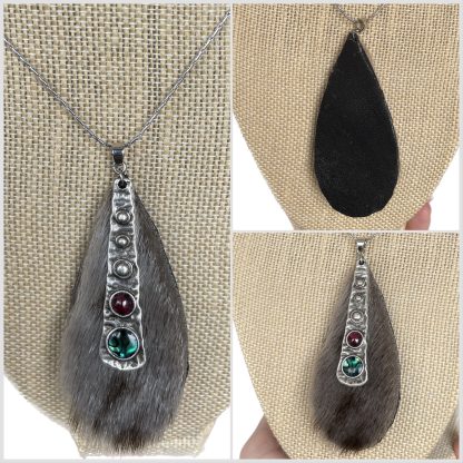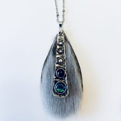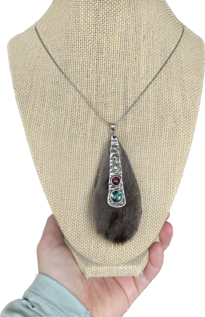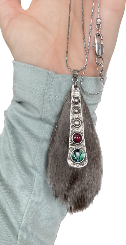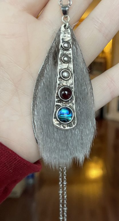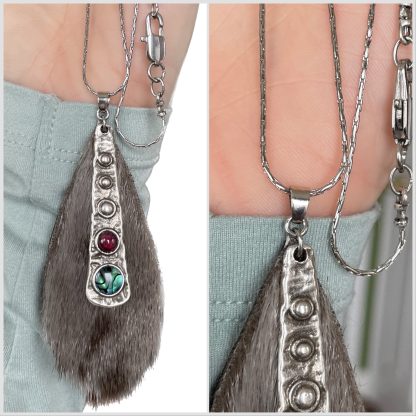 This modern and striking pendant necklace is a larger version of my previous pendant with abalone and garnet gemstones! It features a piece of full, rounded, teardrop-shaped seal fur that backs a rustic cast metal pendant. Rich garnet and abalone cabochons are set on the pendant, for a unique and beautiful piece! The pendant is ~60mmmm in length, and 25mm at its widest point, and the chain is stainless steel. Your necklace will have similar medium grey/spotted seal fur, and cabochons of the same stone type, but each pendant is unique. Displayed chain length is approximately 50cm (20”), but it can be made at a longer length – please indicate at checkout if you would like a different chain style. Phocal Stone Designs will modify your order to your specifications if possible.