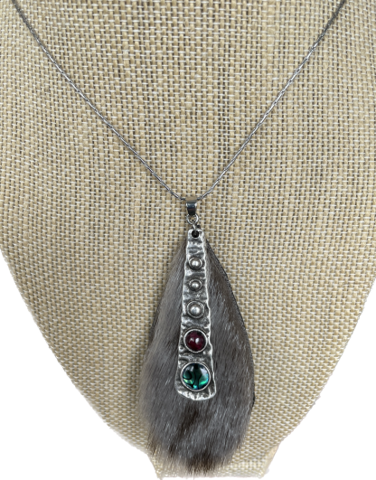 This listing is for the natural grey/silver seal fur version of the pendant. There are other options listed/available. If you have a specific fur colour or gemstone combination you would like, feel free to message me, and I’ll be happy to create a custom piece!