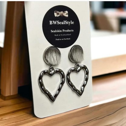 Add a unique touch to your look with Beverley’s Sealskin Earrings. These earrings feature round pieces of sealskin paired with dangling stainless steel hearts, making them a standout accessory.