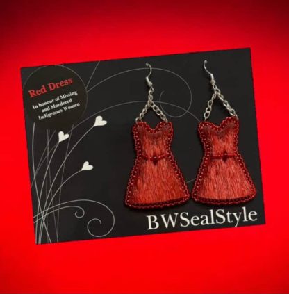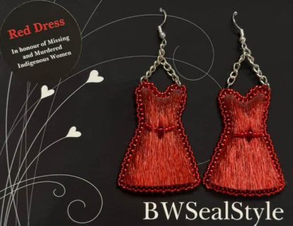In honour of Missing and Murdered Indigenous Women, these handcrafted earrings carry a powerful message of memory and resilience. Made with genuine red leather backing, red silver-lined Czech beads, and sealskin, each pair is finished with 925 sterling silver hooks and a delicate silver chain. Thoughtfully boxed with a clear lid, they’re perfect for gifting.