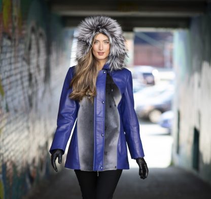 What a gorgeous pop of color! The hood is trimmed with silver fox for warmth and wind protection. This jacket will transition perfectly from fall the winter then winter to spring. It is warm, wind resistant and water repellant. These natural and ethically sourced materials will stay beautiful and warm in harsh winter conditions.